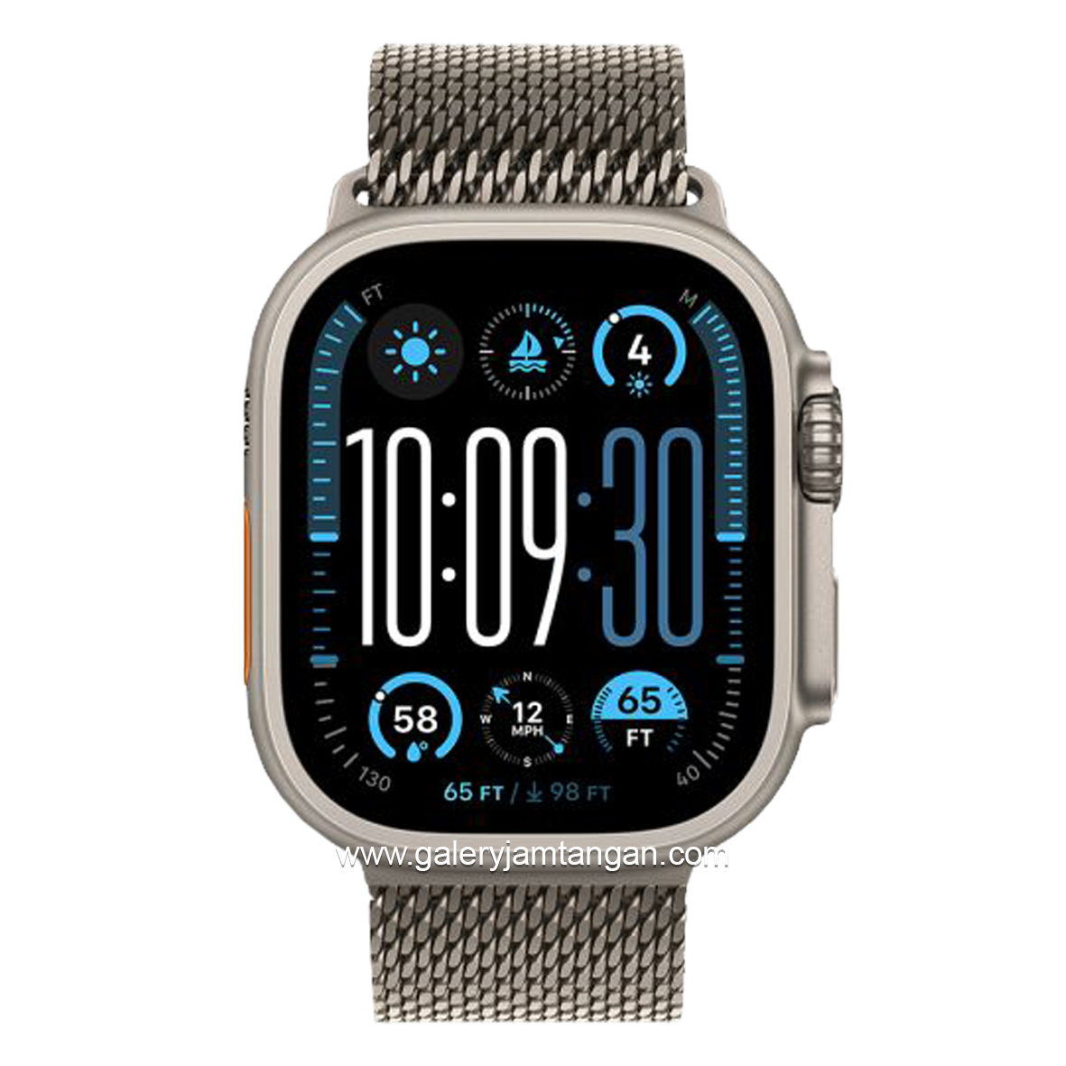 LUAR BIASA TANGGUH, LUAR BIASA ANDAL — Casing titanium 49 mm yang tahan korosi. Kristal depan safir. Digital Crown besar dan tombol Tindakan yang dapat disesuaikan untuk kontrol instan terhadap berbagai fungsi. Teruji untuk MIL-STD 810H. Level tahan air 100 m.